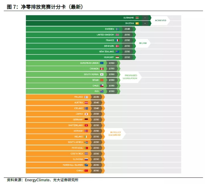 2)能源替代:以风光、储能、氢能、新能源汽车为代表的的新能源行业,包括供应链上下游、制造端、运营端在内的全产业链都将受益于碳中和对投资的拉动;