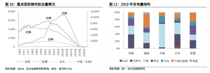 各大碳排放重点国家中,除美国外,碳排放占比最高的均为发电部门(美国为交通,占比45%)。因此,要实现“碳中和”,能源转型首当其冲。