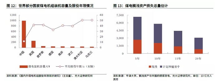 煤电资产搁浅的问题,表明了转型需经历阵痛。一方面,从能源结构和自身禀赋来看,我国的能源消耗以煤为主,煤电发电量在2019年占总发电量的65%,远超发达国家;另一方面,我国煤电机组的平均服役年限仅12年,而发达国家普遍达到40年以上。更快的碳排放量下降斜率,意味着将会有大量的未达到退役年限的煤电资产提前“搁浅”。