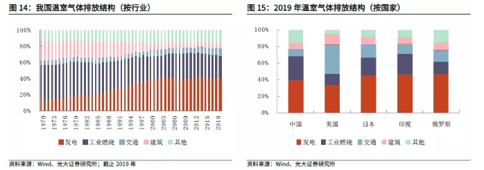 在碳排放量结构方面,目前发电已成为占比最高的部门。2019年我国碳排放量115亿吨,其中发电碳排放量45.69亿吨CO2,占比40%;工业燃烧碳排放量33.12亿吨CO2,占比29%。