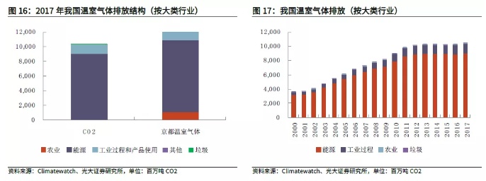 除了能源使用(主要是化石燃料燃烧及电力/热力使用),工业过程碳排放也是重要的二氧化碳来源,2017年占比13%。