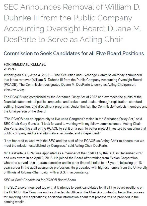 2021-93华盛顿特区,2021 年 6 月 4 日 —美国证监会今天宣布,已将 William D. Duhnke III 从上市公司会计监督委员会(PCAOB) 中撤职。委员会指定 Duane M. DesParte 担任代理主席,即日起生效。