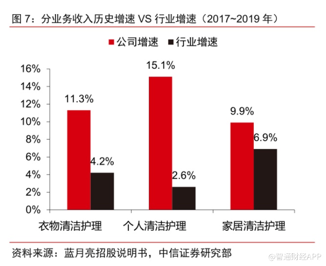 据中信证券研报显示,截至目前,蓝月亮旗下拥有衣物清洁护理、个人清洁护理、家居清洁护理三大品类共80余品种的产品。而从历史增长表现来看,其各细分业务收入历史增速均远高于行业平均水平。