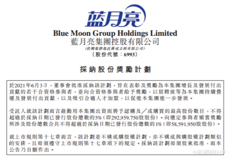 智通财经APP获悉,6月3日,蓝月亮集团(06993)发布公告称,拟以集团资金予认购及╱或购买股份用于实施股份奖励计划,认购及╱或购买股份不超过于采纳日期已发行股份总数的5%(即292,959,750股),向选定参与者颁赏奖励所涉及股份总数不超过于采纳日期已发行股份总数的1%(即58,591,950股)。