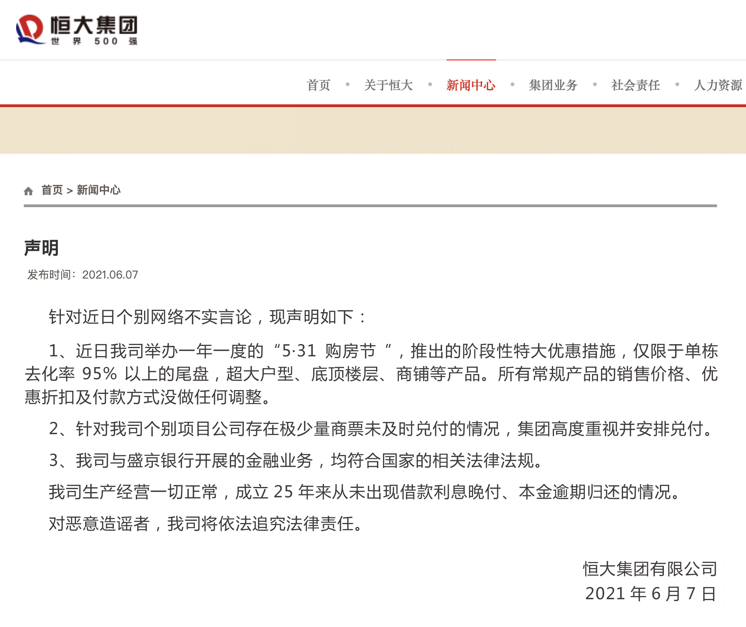 恒大在声明中对几个网上热点问题进行了一一回应:一是近日举办一年一度的“5•31购房节”,推出的阶段性特大优惠措施,仅限于单栋去化率95%以上的尾盘,超大户型、底顶楼层、商铺等产品。所有常规产品的销售价格、优惠折扣及付款方式没做任何调整。二是针对个别项目公司存在极少量商票未及时兑付的情况,集团高度重视并安排兑付。三是与盛京银行开展的金融业务,均符合国家的相关法律法规。声明最后还强调,恒大生产经营一切正常,成立25年来从未出现借款利息晚付、本金逾期归还的情况。