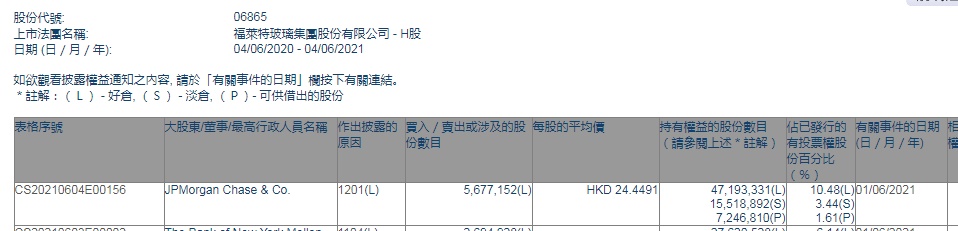 据智通财经APP获悉,香港联交所最新资料显示,6月1日,摩根大通减持福莱特玻璃集团股份有限公司(06865)567.7152万股,每股作价24.4491港元,总金额约为1.388亿港元。减持后最新持股数目约为4719.33万股,最新持股比例为10.48%。