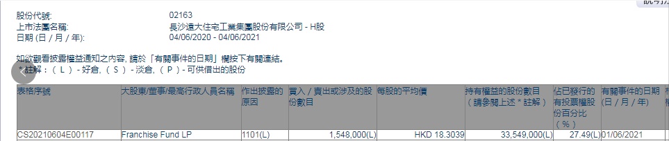 据智通财经APP获悉,香港联交所最新资料显示,6月1日,Franchise Fund LP 增持长沙远大住宅工业集团(02163)154.8万股,每股作价18.3039港元,总金额约为2833.44万港元。增持后最新持股数目约为3354.9万股,最新持股比例为27.49%。