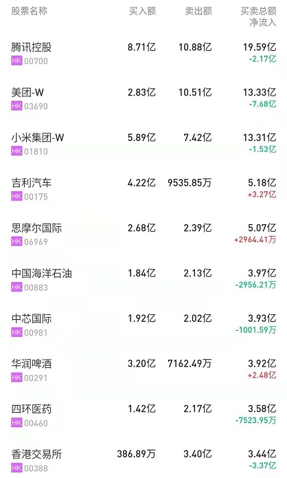 此外,中海油(00883)、中移动(00941)分别获净买入4.81亿、1.48亿港元。而四环医药(00460)、港交所(00388)、腾讯(00700)分别遭净卖出7523万、3.36亿、9.89亿港元。