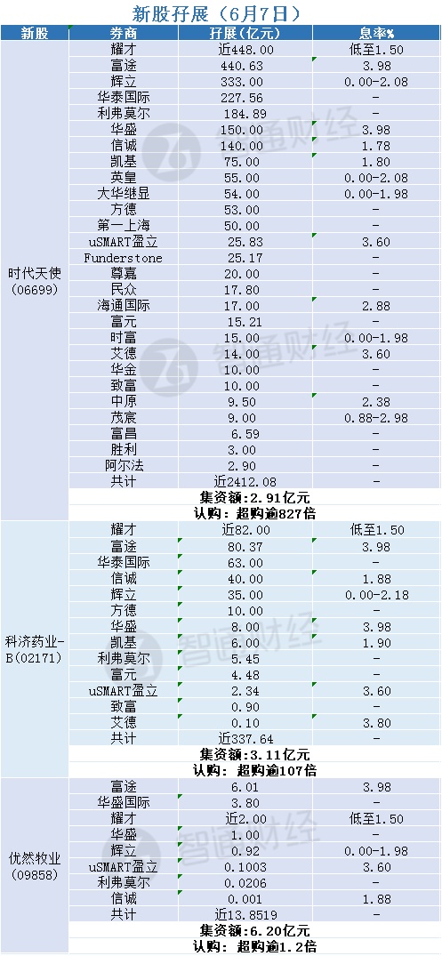 智通财经APP获悉,时代天使(06699)、科济药业-B(02171)、优然牧业(09858)正在招股中。截至6月7日,富途、辉立、耀才等合计分别为其借出近2412.08亿港元、近337.64亿港元、近13.8519亿港元,分别超购逾827倍、107倍、1.2倍。