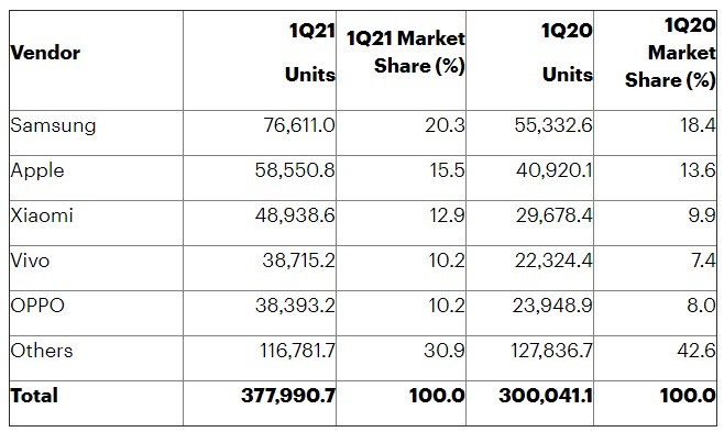 表1 21年第一季度全球智能手机销量前5名(单位:千部)