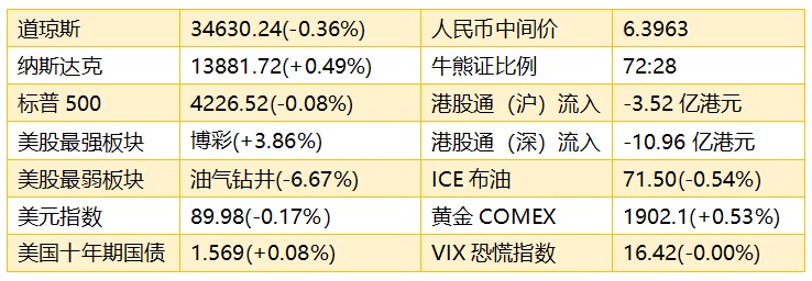 1、隔夜美股收盘,纳斯达克综合指数涨67.23点,涨幅0.49%,报13881.72点;道琼斯指数跌126.15点,跌幅0.36%,报34630.24点;标普500指数跌3.37点,跌幅0.08%,报4226.52点。美联储正不断给市场灌输将会减少每月1200亿美元资产购买的思想准备。官员们在过去几周的评论表明,缩减资产购买的问题很有可能在下周的会议上被提及,且美联储可能会在今年晚些时候或明年年初开始缩减购买量。港股ADR指数小幅上涨,按比例计算,收报28827点,涨39.85点或0.14%。