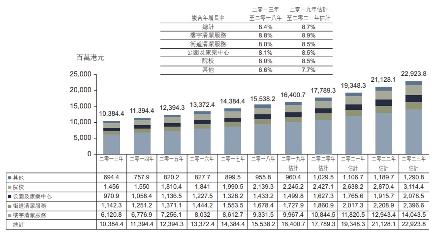 具体而言,相关数据披露,近年来香港智慧城市环卫行业市场一直稳步增长——从2013年的103.844亿港元增长至2018年的155.382亿港元,复合年增长率约为8.4%;同时受惠于卫生意识增强及政府废物处理支出增长,未来预计由2019年的164.007亿港元增至2023年的229.238亿港元,复合年增长率为8.7%。