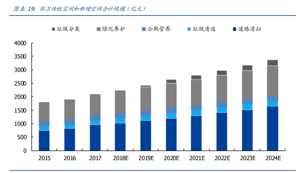 而在上述因素的合力推动下,目前智慧城市环卫行业已逐渐迈入黄金发展阶段——国盛证券指出,环卫传统空间于2020年将达到2078亿元,新增空间(绿化养护+垃圾分类)有望达到1307亿元,合计市场空间在3385亿元。