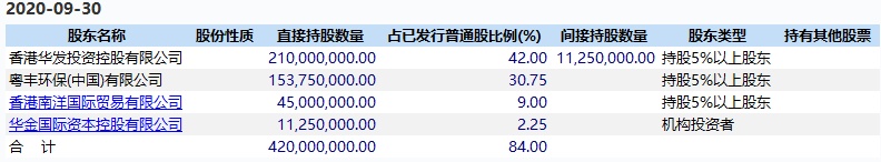 查询股权结构发现,截至2020年9月30日,庄臣控股第一大股东为香港华发投资控股有限公司,持股为42%;第二大股东和第三大股东则分别为为粤丰环保(中国)有限公司和香港南洋国际贸易有限公司,分别持股为30.75%和9%。