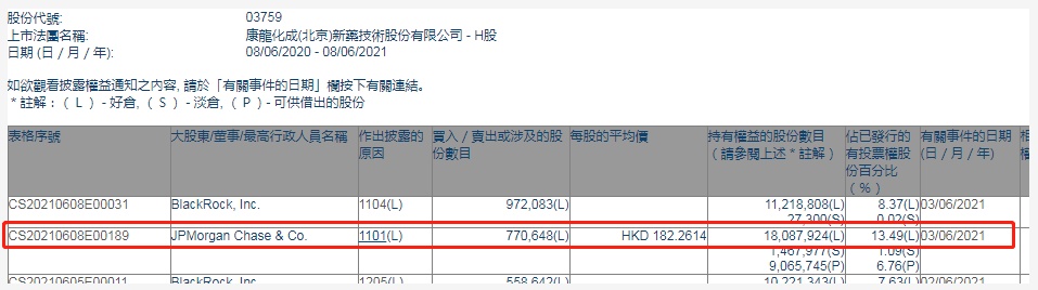 智通财经APP获悉,香港联交所最新资料显示,6月3日,摩根大通增持康龙化成(03759)77.0648万股,每股作价182.2614港元,总金额约为1.4亿港元。增持后最新持股数目约为1808.8万股,最新持股比例为13.49%。