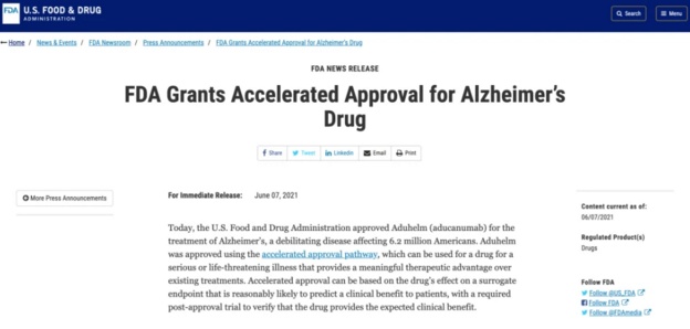 在6月7日FDA的批准声明中,FDA表示,在仔细审评了临床试验结果并征求各方意见后,得出最终结论,Aducanumab对阿尔茨海默病患者的益处超过风险。
