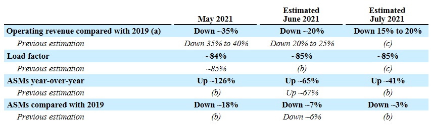 智通财经APP获悉,西南航空(LUV.US)今日更新了其财务及运营业绩指引。该公司表示,2021年5月份营业收入符合公司预期,处于其指引区间的较优端,主要是由于休闲旅行客流量及票价的改善。基于此,该公司预计6月和7月的休闲旅行票价水平将与2019年同期持平,预计6月份和7月份营业收入较2019年同期将分别下降约20%和15%-20%。