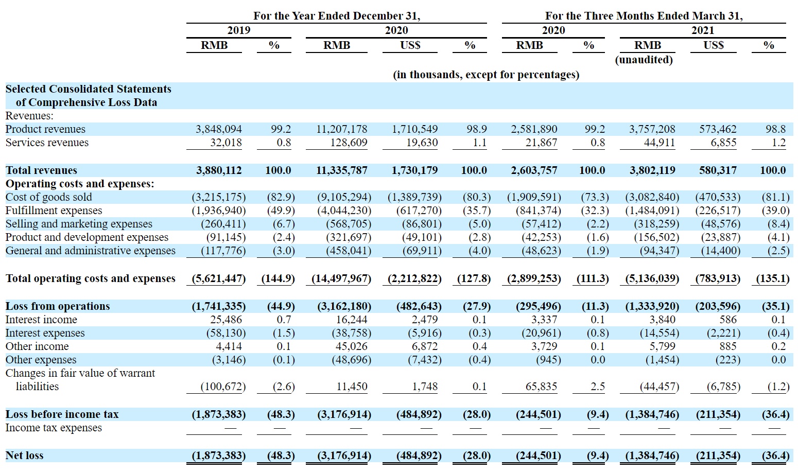 2021年第一季度,平均月度交易用户数达690万。GMV从2018年的7.417亿元(人民币,下同)增长到2020年的130.32亿元,年复合增长率为319.2%。