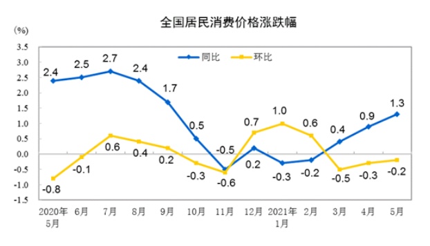智通财经APP获悉,国家统计局公布,2021年5月份,全国居民消费价格同比上涨1.3%。其中,城市上涨1.4%,农村上涨1.1%;食品价格上涨0.3%,非食品价格上涨1.6%;消费品价格上涨1.6%,服务价格上涨0.9%。1—5月平均,全国居民消费价格比去年同期上涨0.4%。