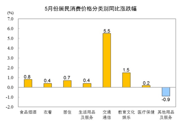 其他七大类价格同比六涨一降。其中,交通通信、教育文化娱乐、居住价格分别上涨5.5%、1.5%和0.7%,衣着、生活用品及服务、医疗保健价格分别上涨0.4%、0.4%和0.2%;其他用品及服务价格下降0.9%。
