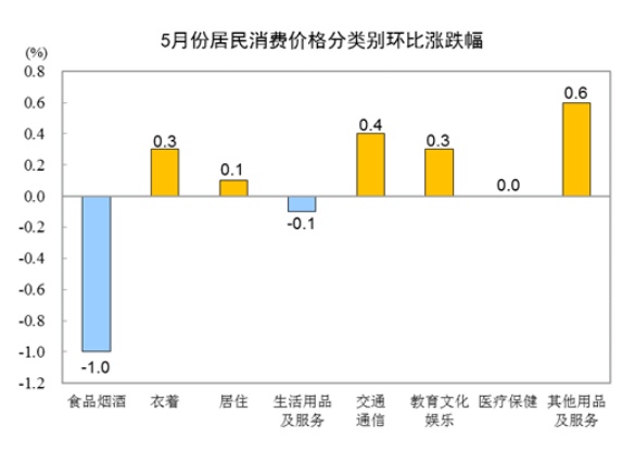 5月份,全国居民消费价格环比下降0.2%。其中,城市下降0.1%,农村下降0.3%;食品价格下降1.7%,非食品价格上涨0.2%;消费品价格下降0.4%,服务价格上涨0.2%。