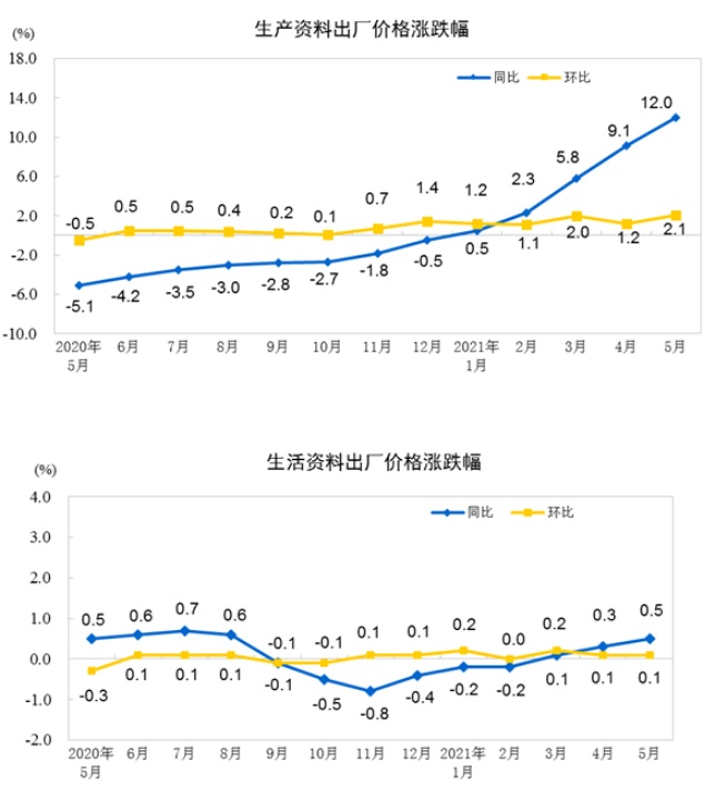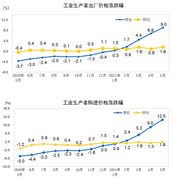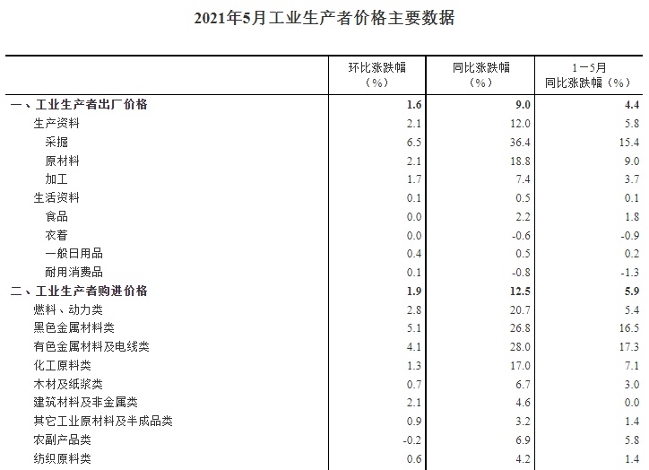 智通财经APP获悉,国家统计局公布,2021年5月份,全国工业生产者出厂价格同比上涨9.0%,环比上涨1.6%;工业生产者购进价格同比上涨12.5%,环比上涨1.9%。1—5月平均,工业生产者出厂价格比去年同期上涨4.4%,工业生产者购进价格上涨5.9%。