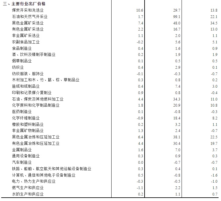 工业生产者出厂价格中,生产资料价格上涨12.0%,涨幅比上月扩大2.9个百分点,影响工业生产者出厂价格总水平上涨约8.87个百分点。其中,采掘工业价格上涨36.4%,原材料工业价格上涨18.8%,加工工业价格上涨7.4%。生活资料价格上涨0.5%,涨幅扩大0.2个百分点,影响工业生产者出厂价格总水平上涨约0.14个百分点。其中,食品价格上涨2.2%,衣着价格下降0.6%,一般日用品价格上涨0.5%,耐用消费品价格下降0.8%。