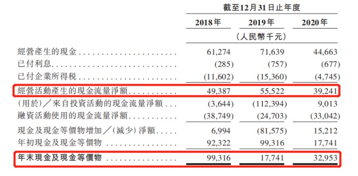 另外,现金流方面,2018年至2020年,天润云的经营活动产生的现金流量净额分别为0.49亿元、0.55亿元、0.39亿元;年末现金及现金等价物分别为0.99亿元、0.17亿元,0.33亿元。从上述数据表现来看,不难看出,该公司目前的现金流似乎也不是处于十分充裕的状态。