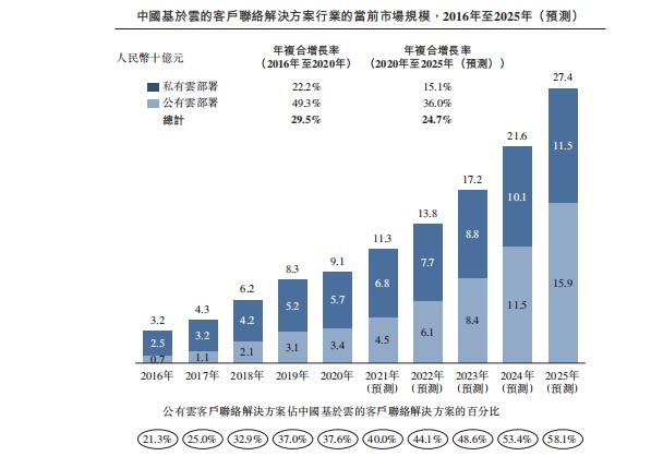 据灼识咨询报告数据披露,中国基于云的客户联络解决方案的市场规模(按收入计)由2016年的人民币32亿元增至2020年的人民币91亿元,年复合增长率为 29.5%,并预计于2025年达到人民币274亿元,自2020年至2025年的年复合增长率为24.7%。