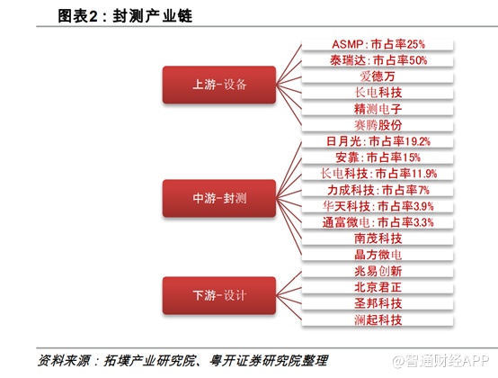 智通财经APP了解到,封测包括封装和测试,位于半导体产业链后段,是芯片从设计——制造——投入市场前的最后一个环节。根据产业链划分来看,封测产业链又分为上游的封测设备、中游半导体封测以及下游的IC设计厂。