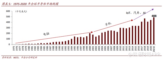半导体是具备成长和周期双重属性的行业,其中成长性是主旋律。自1975年以来,半导体产值由50亿美元增长到近5000亿美元,接近100倍的成长。从成长的角度来看,当前半导体产业已进入5G、新能源汽车、人工智能、云计算、物联网等创新技术驱动的新增长阶段,半导体产业规模有望迈上新台阶。