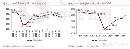 美欧是全球重要的半导体产品输出国,也是全球受大环境影响较为严重的区域,2020年以来晶圆厂商普遍产能利用率低下。2020年2月,美国半导体厂商的产能利用率约77%,3月份受疫情影响开始下滑,4月份达到最低为64%,之后产能利用率开始爬升,截至今年3月份,产能利用率最高到75%左右,仍未达到疫情前77%左右的产能利用率。欧洲受到的影响不逊于美国,欧洲制造业2020年Q1之前,产能利用率在81%以上,Q2受疫情影响下降到68.4%,今年Q1仅恢复到77.5%,亦未达到疫情前的水平。