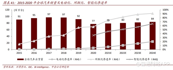 在汽车领域方面,2020年全球汽车销量7700万辆。虽然汽车销量并没有大幅增长,但是近年来,汽车正朝着电动化、网联化、智能化等趋势发展。中金公司测算2020年全球汽车电动化渗透率达到4.17%,网联化渗透率达到57.2%,智能化渗透率(L1-L5)达到35.73%(主要是L1/L2自动驾驶)。