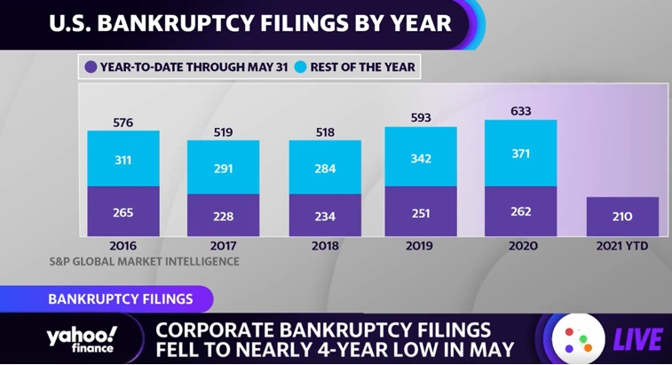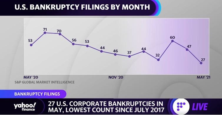 据标准普尔全球市场情报公司,5月美国只有27家企业破产,是自2017年7月以来的最低水平。