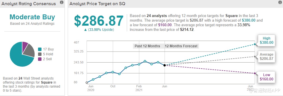 华尔街有17位分析师予Square“买入”评级,5位予“持有”评级,2位予“卖出”评级,共识评级为“温和买入”,平均目标价为286.87美元,意味着股价较目前水平有34%的上涨空间。