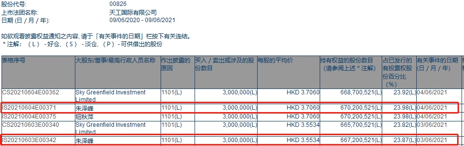 根据香港联交所最新资料显示,6月3日,朱泽峰增持天工国际300万股,每股作价3.5534港元,总金额为1066.02万港元;6月4日,朱泽峰继续增持公司300万股,每股作价3.706港元,总金额为1111.8万港元。