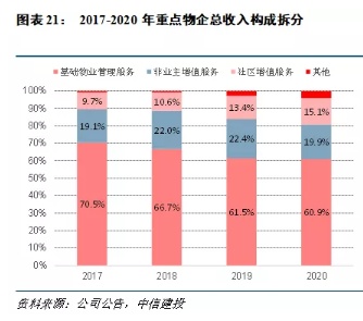 据中信建投研报,过去几年国内主流上市物企的增值服务收入占比总体呈增长态势,由2017年的28.8%提升至2020年35%。目前行业普遍认为物企的收入结构有望实现物业服务和增值服务收入占比五五开,而这也意味着接下来增值服务仍将保持增长态势直至收入规模与基础物管规模相当。