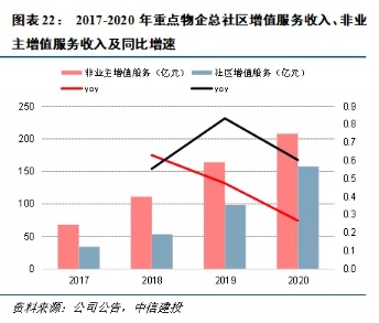 具体来看主流上市物企的增值服务板块业绩表现,据中信建投数据2020年24家物企共实现社区增值服务收入157.8亿元,同比增长60.4%;2017年-2020年的复合年增长率达到66%。非主业增值服务实现收入共208.2亿元,较2019年同比增长26.8%;2017年-2020年复合年增长率达到45%。