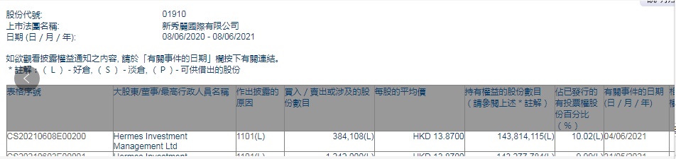 智通财经APP获悉,香港联交所最新资料显示,6月4日,Hermes Investment Management增持新秀丽(01910)约38.4万股,每股作价13.87港元,总金额约为532.76万港元。增持后最新持股数目约为1.44亿股,最新持股比例为10.02%。