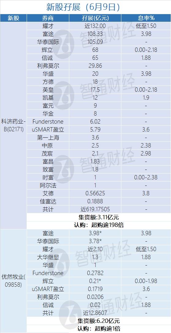 智通财经APP获悉,科济药业-B(02171)和优然牧业(09858)正在招股中。截至6月9日,富途、辉立、耀才等合计分别为其借出近619.17505亿港元、近12.8607亿港元,分别超购逾198倍、1倍。