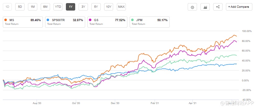 摩根士丹利过去一年的总回报率为89%,超过了高盛(GS.US)和摩根大通(JPM.US)等同行,如下图所示。