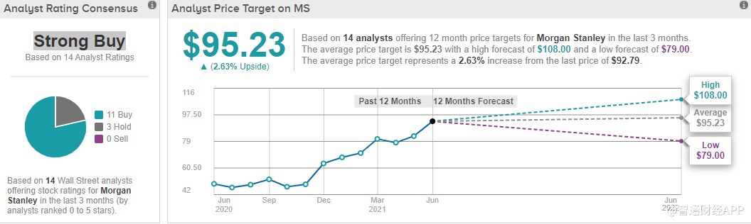 华尔街有11位分析师予摩根士丹利“买入”评级,3位予“持有”评级,共识评级为“强烈买入”(strong buy),平均目标价为95.23美元,较当前股价有2.63%的上涨空间。
