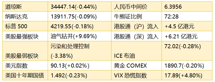 1、隔夜美股收盘,纳斯达克综合指数跌13.16点,跌幅0.09%,报13911.75点;道琼斯指数跌152.68点,跌幅0.44%,报34447.14点;标普500指数跌7.71点,跌幅0.18%,报4219.55点。港股ADR指数下跌,按比例计算,收报28686点,跌55.93点或0.19%。