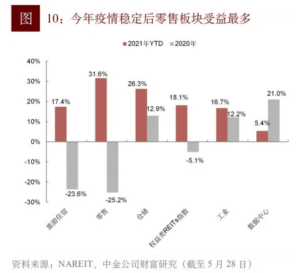 5月权益类REITs指数上涨0.8%,YTD达18.1%,跑赢同期标普500指数的12.6%。具体来看,5月零售、住宿板块分别上涨1.6%、3.5%,表现相对突出,印证了我们此前的判断。