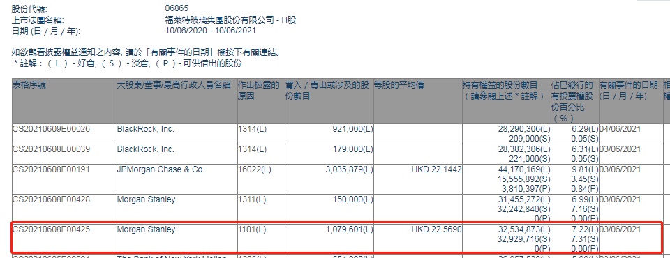 智通财经APP获悉,香港联交所最新资料显示,6月3日,摩根士丹利增持福莱特玻璃(06865)约107.96万股,每股作价22.569港元,总金额约为2436.55万港元。增持后最新持股数目约为3253.49万股,最新持股比例为7.22%。