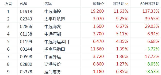 从盘面上来看,截止收盘,中远海控(01919)大涨11.63%领涨板块,太平洋航运(02343)上涨9.25%,中远海发(02866)则涨超6%,中远海能、中远海运港口、招商局港口等航运股皆纷纷跟涨。