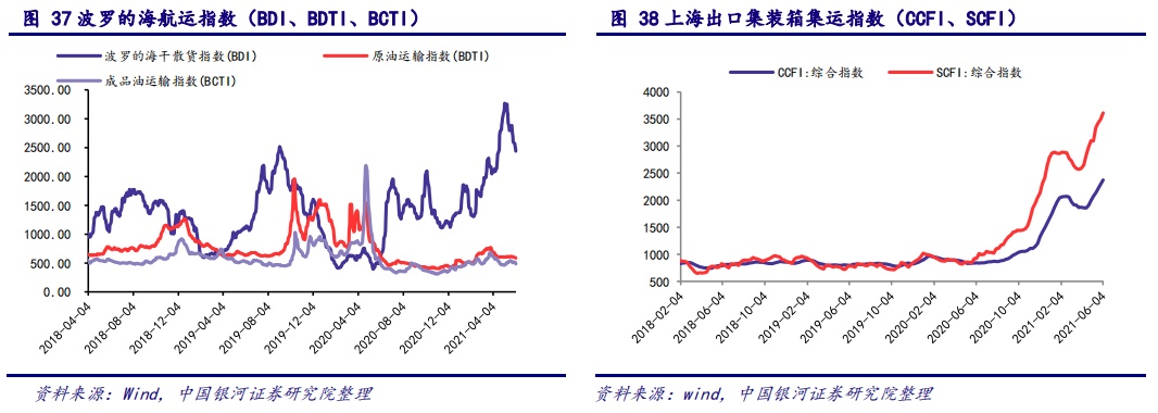 从能够代表航运业景气度的波罗的海干散货综合运价指数BDI和中国集装箱集运指数CCFI来看:自2020年下半年开始,BDI便开始震荡上行,至2021年6月4日该指数同比上涨285.76%至2438点;与此同时,CCFI也几乎跟随这一路线往上走,同比涨182.2%至2373.77点。由此可见,自2020年下半年起,这一行业相较于2019年8月的低迷状态而言,已然呈现出强劲的复苏之势。