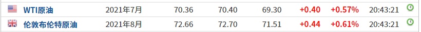 截至发稿,WTI原油涨0.57%,报70.36美元/桶。布伦特原油涨0.61%,报72.66美元/桶。
