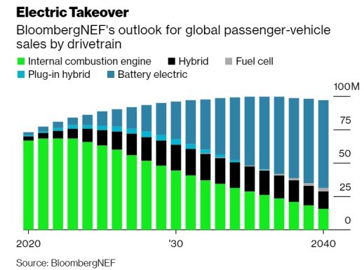 BNEF预测,如果各国政府不再采取进一步的政策激励措施,到2030年,新型电动汽车的销量将达到全球总量的34%,到2040年将达到68%。