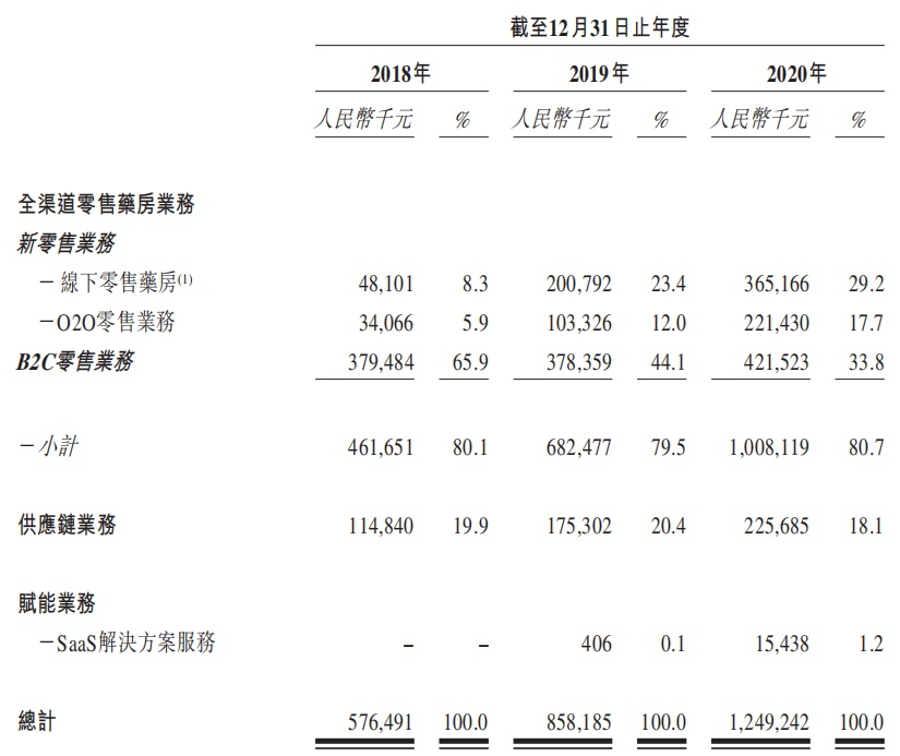 进一步细分,泉源堂大药房的全渠道零售药房业务又包含了线下零售药房、O2O零售业务、B2C零售业务。根据弗若斯特沙利文的资料,按2020年每月每间药房平均订单数计算,泉源堂大药房在中国所有自营线上到线下及线下零售药房中排名第一。